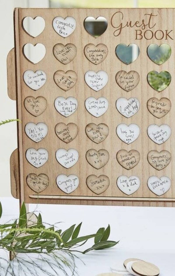 The game is east to construct with all elements provided, simply ask your guests to sign a token and slot into the four in a row holder.